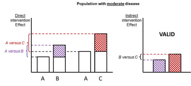 Figure 11.2.d shows hypothetical examples of valid and invalid indirect comparisons for the dietary advice example. Suppose a single effect modifier is severity of disease (e.g. obesity measured by the BMI score). The top row depicts a situation in which all patients in all trials have moderate severity. There are AB studies and AC studies in this population. Estimation of BC is valid here because there is no difference in the effect modifier. The second row depicts a similar situation in a second population of patients who all have severe disease. A valid indirect estimate of B versus C for this population can also be made. In the third row we depict a situation in which all AB trials are conducted only in moderately obese populations and all AC trials are conducted only in severely obese populations. In this situation, the distribution of effect modifiers is different in the two direct comparisons, so the indirect effect based on this row is invalid (due to intransitivity).