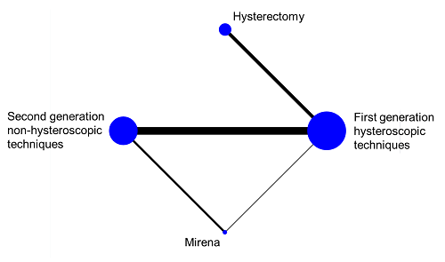 Figure 11.4.a Network graph of four interventions for heavy menstrual bleeding (Middleton et al 2010). The size of the nodes is proportional to the number of participants assigned to the intervention and the thickness of the lines is proportional to the number of randomized trials that studied the respective direct comparison. Reproduced with permission of BMJ Publishing Group