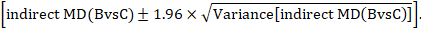 A 95% confidence interval for the indirect summary effect is constructed by the formula: