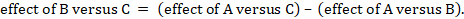 such that the difference between the summary statistics of the intervention effect in the direct A versus C and A versus B meta-analyses provides an indirect estimate of the B versus C intervention effect.