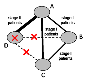 Figure 11.3.a Example of a network comparing four chemotherapy regimens, where transitivity is violated due to incomparability between the interventions