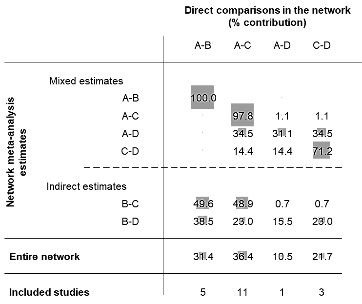Figure 11.6.b Contribution matrix for the network on interventions for heavy menstrual bleeding presented in Figure 11.4.a. Four direct comparisons in the network are presented in the columns, and their contributions to the combined treatment effect are presented in the rows. The entries of the matrix are the percentage weights attributed to each direct comparison. The intervention labels are: A, first generation hysteroscopic techniques; B, hysterectomy; C, second generation non-hysteroscopic techniques; D, Mirena