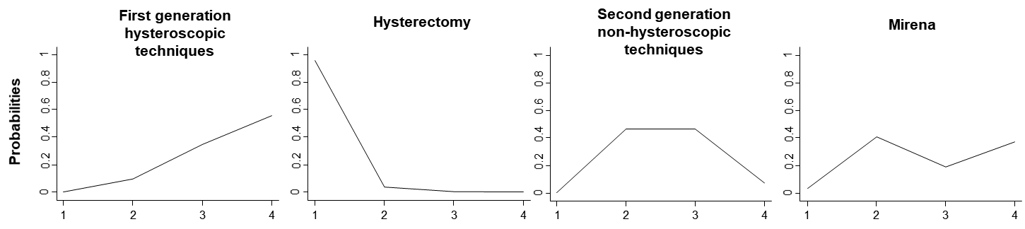 Ranking probabilities for all possible ranks may be presented by drawing probability lines, which are known as rankograms, and show the distribution of ranking probabilities for each intervention (Salanti et al 2011). The rankograms for the heavy menstrual bleeding network example are shown in Figure 11.6.d. The graph suggests that ‘Hysterectomy’ has the highest probability of being the best intervention, ‘First generation hysteroscopic techniques’ have the highest probability of being worst followed by ‘Mirena’ and ‘Second generation non-hysteroscopic techniques’ have equal chances of being second or third.