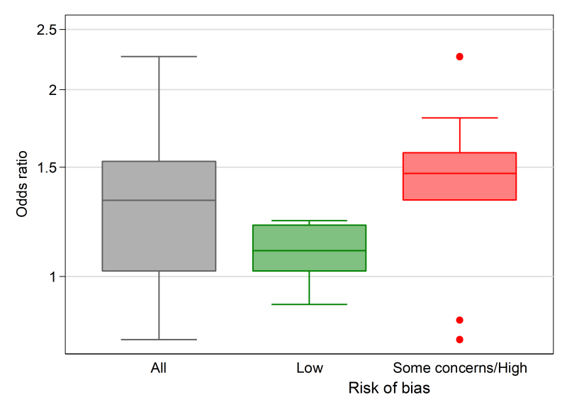 In Scenario 2, effect estimates are available for all outcomes. However, for most studies, a measure of variance is not reported, or cannot be calculated from the available data. We illustrate how the effect estimates may be summarized using descriptive statistics. In this scenario, it is possible to calculate odds ratios for all studies. For the continuous outcomes, this involves first calculating a standardized mean difference, and then converting this to an odds ratio (Chapter 10, Section 10.6). The median odds ratio is 1.32 with an interquartile range of 1.02 to 1.53 (15 studies). Box-and-whisker plots may be used to display these results and examine informally whether the distribution of effects differs by the overall risk-of-bias assessment (Figure 12.4.a, Panel A). However, because there are relatively few effects, a reasonable alternative would be to present bubble plots (Figure 12.4.a, Panel B).