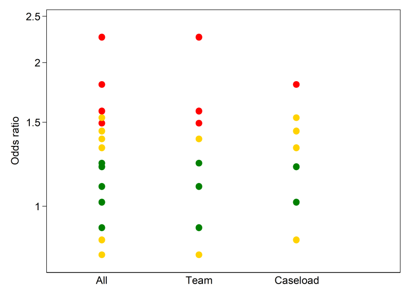 Figure 12.4.a Possible graphical displays of different types of data. (A) Box-and-whisker plots of odds ratios for all outcomes and separately by overall risk of bias. (B) Bubble plot of odds ratios for all outcomes and separately by the model of care. The colours of the bubbles represent the overall risk of bias judgement (green = low risk of bias; yellow = some concerns; red = high risk of bias). (C) Albatross plot of the study sample size against P values (for the five continuous outcomes in Table 12.4.c, column 6). The effect contours represent standardized mean differences. (D) Harvest plot (height depicts overall risk of bias judgement (tall = low risk of bias; medium = some concerns; short = high risk of bias), shading depicts model of care (light grey = caseload; dark grey = team), alphabet characters represent the studies)