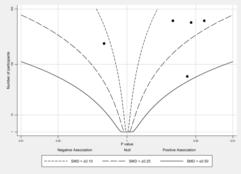 The combination of P values suggests there is strong evidence of benefit of midwife-led models of care in at least one study (P < 0.001 from a Chi2 test, 13 studies). Restricting this analysis to those studies judged to be at an overall low risk of bias (sensitivity analysis), there is no longer evidence to reject the null hypothesis of no benefit of midwife-led model of care in any studies (P = 0.314, 3 studies). For the five studies reporting continuous satisfaction outcomes, sufficient data (precise P value, direction, total sample size) are reported to construct an albatross plot (Figure 12.4.a, Panel C). The location of the points relative to the standardized mean difference contours indicate that the likely effects of the intervention in these studies are small.