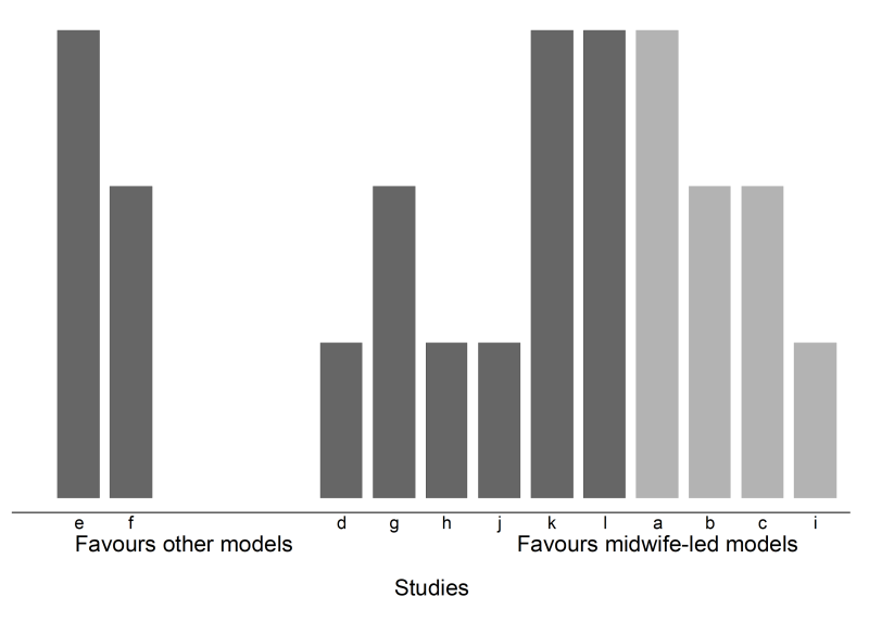 Of the 15 studies, we exclude three because they do not provide information on the direction of effect, leaving 12 studies to contribute to the synthesis. Of these 12, 10 effects favour midwife-led models of care (83%). The probability of observing this result if midwife-led models of care are truly ineffective is 0.039 (from a binomial probability test, or equivalently, the sign test). The 95% confidence interval for the percentage of effects favouring midwife-led care is wide (55% to 95%).