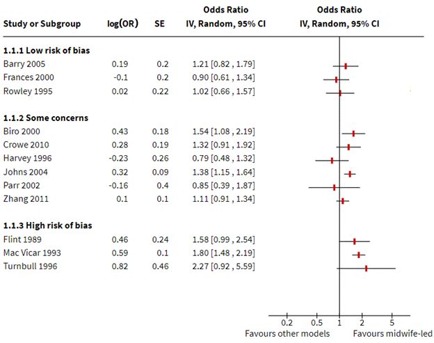 ‘There was strong evidence of benefit of midwife-led models of care in at least one study (P < 0.001, 13 studies). However, a sensitivity analysis restricted to studies with an overall low risk of bias suggested there was no effect of midwife-led models of care in any of the trials (P = 0.314, 3 studies). Estimated standardized mean differences for five of the outcomes were small (ranging from –0.13 to 0.45) (Figure 12.4.a, Panel C).’