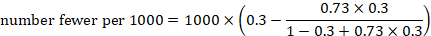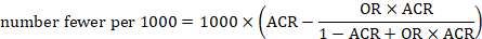 As an example, suppose the odds ratio is OR = 0.73, and a comparator risk of ACR = 0.3 is assumed. Then the effect on risk is 62 fewer per 1000: