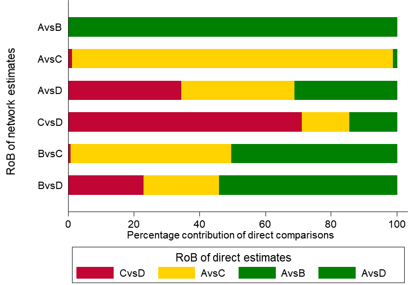 Figure 11.6.b Contribution matrix for the network on interventions for heavy menstrual bleeding presented in Figure 11.4.a. Four direct comparisons in the network are presented in the columns, and their contributions to the combined treatment effect are presented in the rows. The entries of the matrix are the percentage weights attributed to each direct comparison. The intervention labels are: A, first generation hysteroscopic techniques; B, hysterectomy; C, second generation non-hysteroscopic techniques; D, Mirena