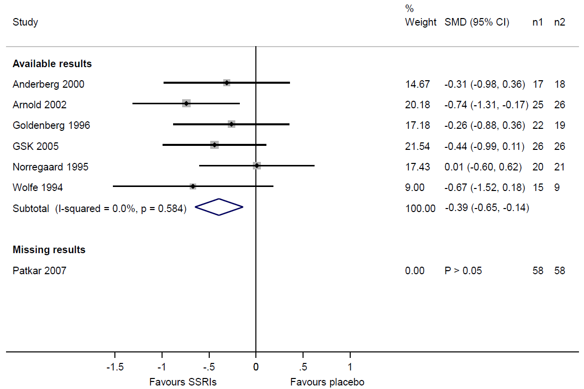 Table 13.3.a Matrix indicating availability of study results for three meta-analysis of trials comparing selective serotonin reuptake inhibitors (SSRIs) with placebo for fibromyalgia (Walitt et al 2015